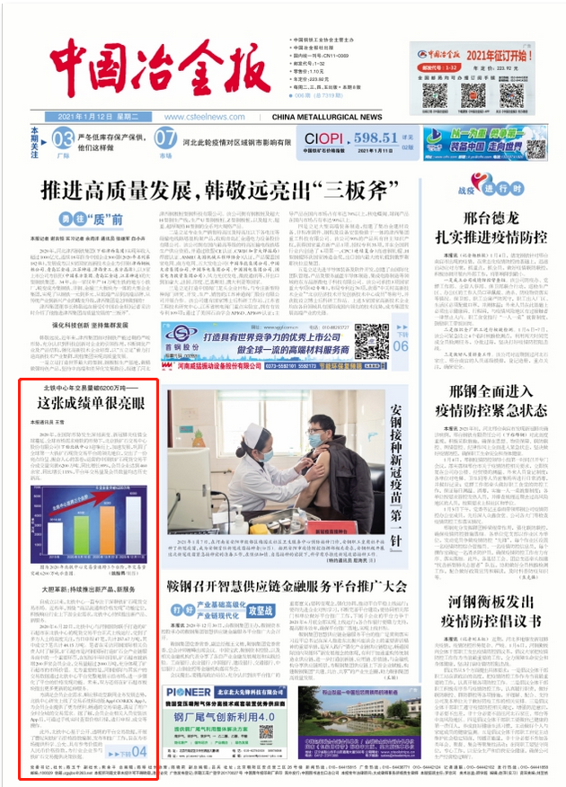 編者按:1月12日,《中國冶金報》頭版以《北鐵中心年交易量破6200萬噸——這張成績單很亮眼》為題,重點報道了我公司圍繞 “商品流通和價格發現”功能定位,積極響應行業上下游企業需求,憑借優質高效服務贏得了行業企業的高度認可,年成交量連跨三個臺階的突出成績?,F將報道全文轉載如下: