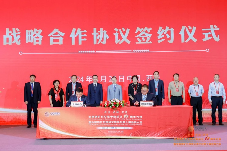 2024年6月28日,北京鐵礦石交易中心(簡稱“北鐵中心”)與德龍鋼鐵集團(tuán)在西安舉辦戰(zhàn)略合作協(xié)議簽約儀式。北鐵中心總裁游松及德龍鋼鐵集團(tuán)營銷中心總經(jīng)理李君亮代表雙方簽署協(xié)議,中國鋼鐵工業(yè)協(xié)會副會長駱鐵軍、中國五礦化工進(jìn)出口商會副會長錢景汾、中國礦產(chǎn)資源集團(tuán)副總經(jīng)理紀(jì)超等領(lǐng)導(dǎo)出席儀式并見證簽約。