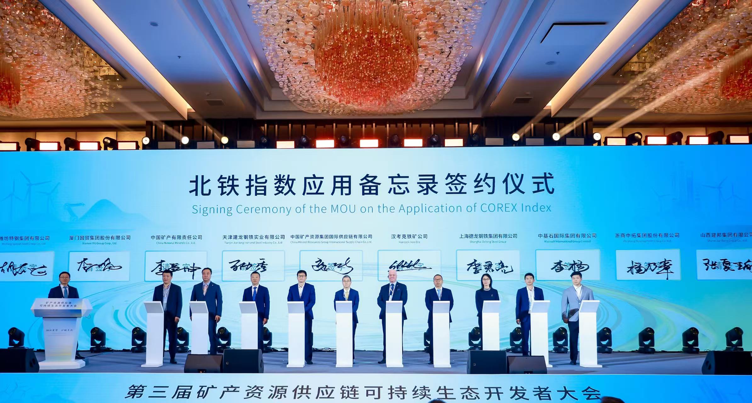 一聲落定,萬眾矚目!11月6日,在上海召開的“第三屆礦產資源供應鏈可持續生態開發者大會”(簡稱“大會”)見證重要時刻——鋼鐵產業鏈上下游10家領軍企業共同簽署北鐵指數應用備忘錄,表示將逐步在鐵礦石貿易中采用北京鐵礦石交易中心(簡稱“北鐵中心”)發布的港口現貨價格指數(簡稱“北鐵指數”)作為結算依據。