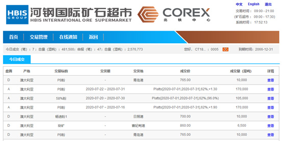 6月22日,由北鐵中心與河鋼共同打造的礦石超市業(yè)務板塊上線運行,當日申報47筆共計257.67萬噸,其中成交7筆共計48.15萬噸。