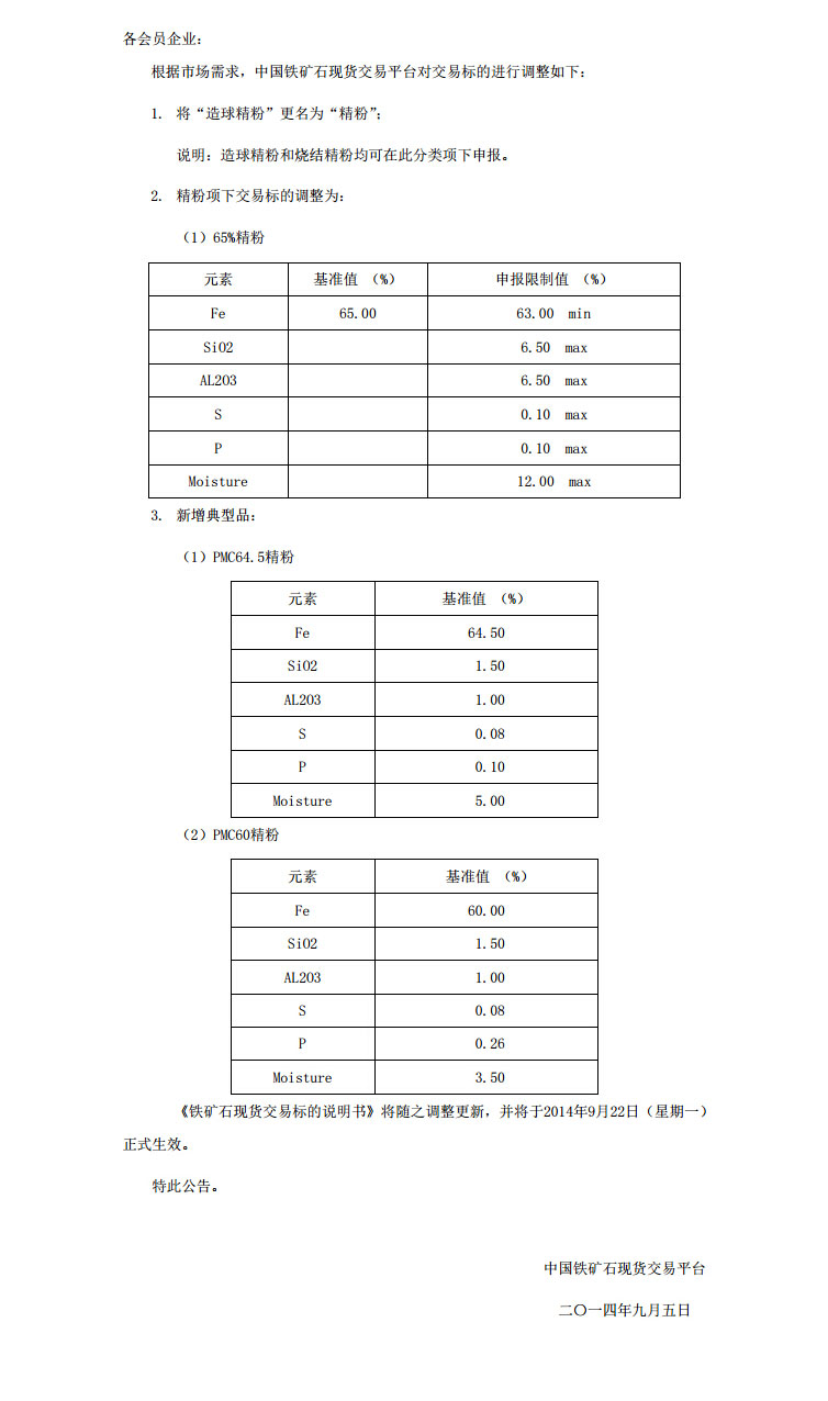 中國鐵礦石現(xiàn)貨交易平臺關(guān)于調(diào)整交易標的的公告