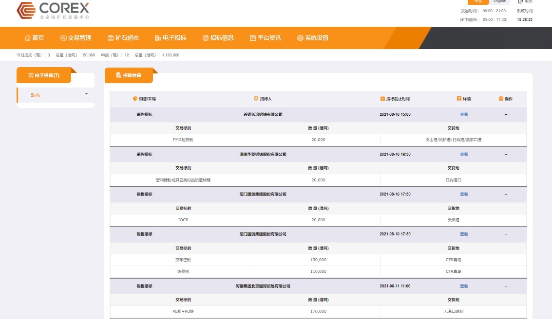 為進(jìn)一步提升綜合服務(wù)能力,滿足行業(yè)企業(yè)對(duì)交易合規(guī)性、便利性和購(gòu)銷渠道多元化的需求,北鐵中心聯(lián)合廈門國(guó)貿(mào)集團(tuán)等單位,在深入調(diào)研的基礎(chǔ)上推出了鐵礦石現(xiàn)貨電子招標(biāo)系統(tǒng)。據(jù)悉,該系統(tǒng)上線當(dāng)日,廈門國(guó)貿(mào)、華菱鋼鐵、河鋼國(guó)際、首鋼長(zhǎng)治等企業(yè)通過(guò)系統(tǒng)發(fā)布采購(gòu)和銷售招標(biāo)信息,截止15時(shí)30分合計(jì)47萬(wàn)噸,購(gòu)銷品種包括FMG超特粉、巴粗、智利精粉、紐曼粉、金布巴粉、PB粉、PB塊等品種,交貨地涵蓋天津港、嵐山港、嵐橋港、日照港、青島港、董家口港及江內(nèi)港口。