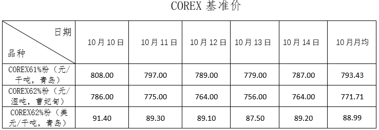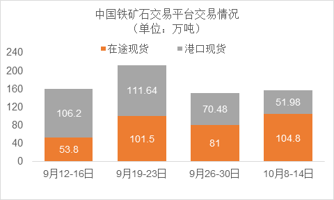 10月8日~10月14日成交45筆共156.78萬噸,其中在途7筆共104.8萬噸,港口38筆共51.98萬噸。主要成交品種包括: PB粉12筆共48.2萬噸,麥克粉8筆共19.08萬噸,BRBF 4筆共36萬噸,F(xiàn)MG混合粉2筆共20.3萬噸,紐曼粉2筆共5萬噸,金布巴混合粉2筆共2萬噸, FMG超特粉1筆共3萬噸。