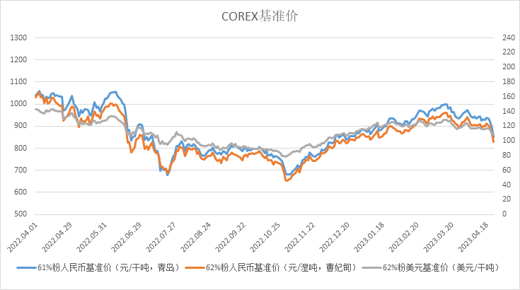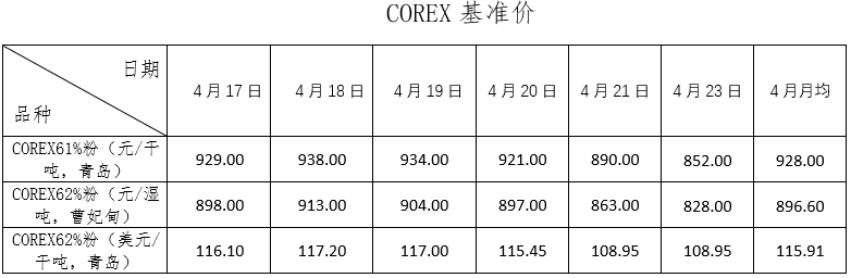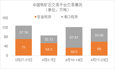 4月17日~4月23日成交63筆共115.66萬噸,其中在途5筆共60萬噸,港口58筆共55.66萬噸。主要成交品種包括:PB粉11筆共28.4萬噸,金布巴混合粉5筆共29萬噸,麥克粉2筆共7.5萬噸,紐曼塊1筆共8萬噸,卡拉加斯粉3筆6.57萬噸,FMG混合粉4筆共4萬噸。